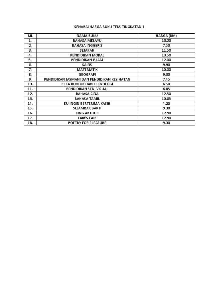 Senarai Harga Buku Teks Tingkatan 1