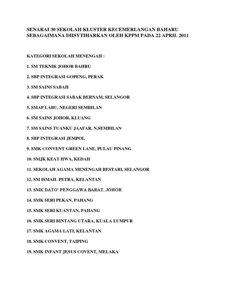 Senarai Sekolah Kluster Kecemerlangan Baharu Sebagaimana Diisytiharkan Oleh Kppm Pada 22 April 2011