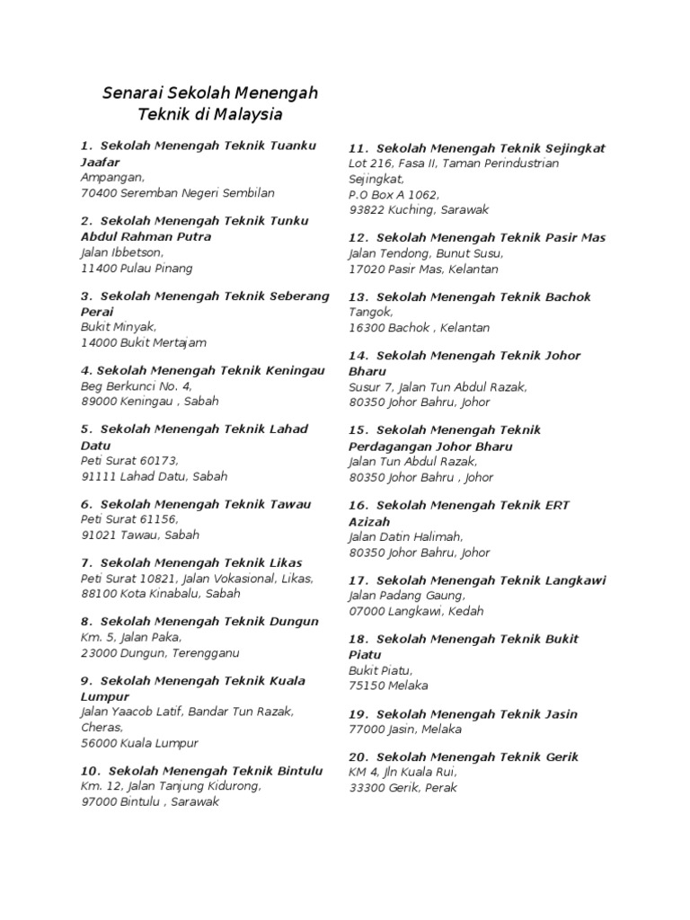 Senarai Sekolah Menengah Teknik Di Malaysia