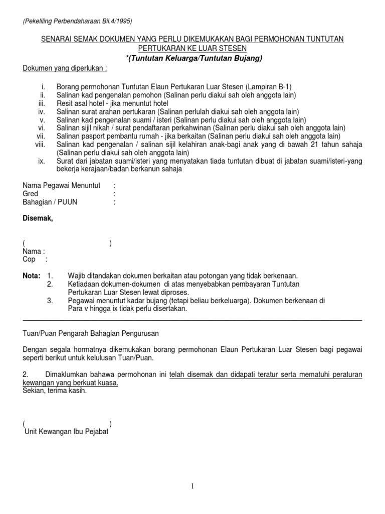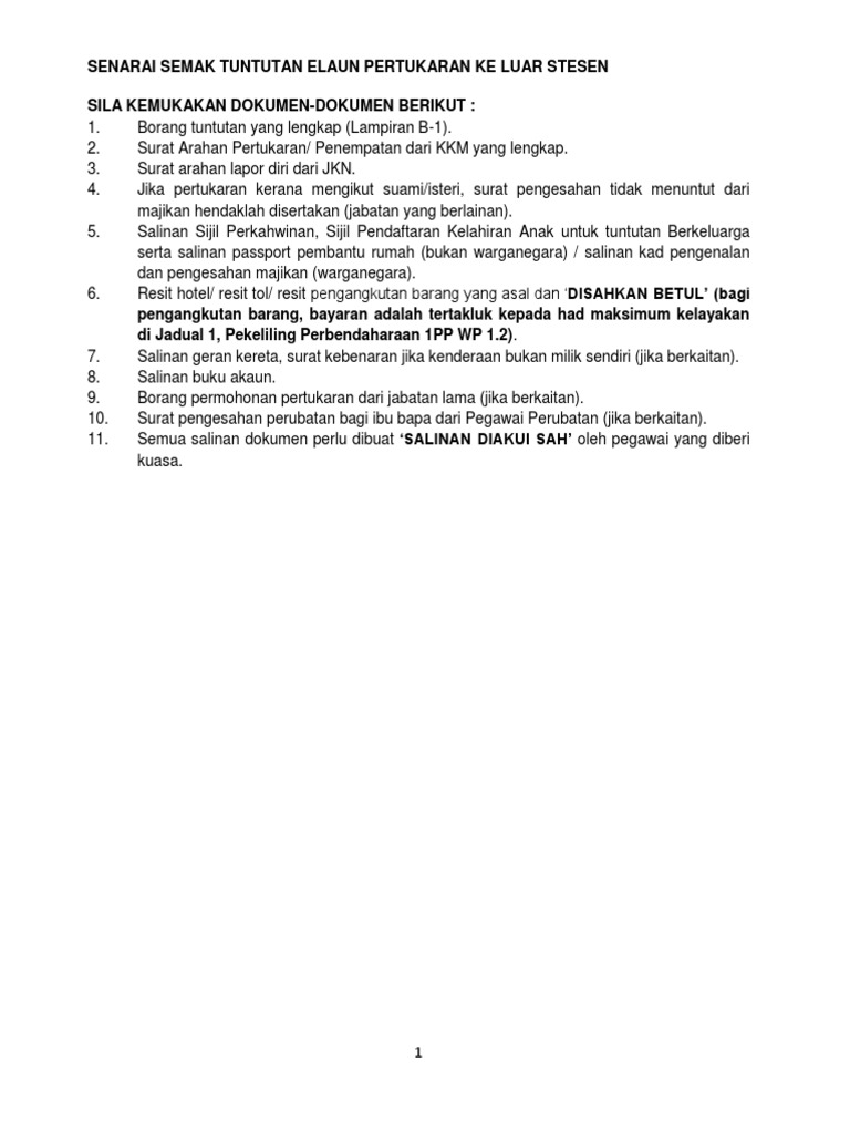 Senarai Semak Tuntutan Elaun Pertukaran Ke Luar Stesen