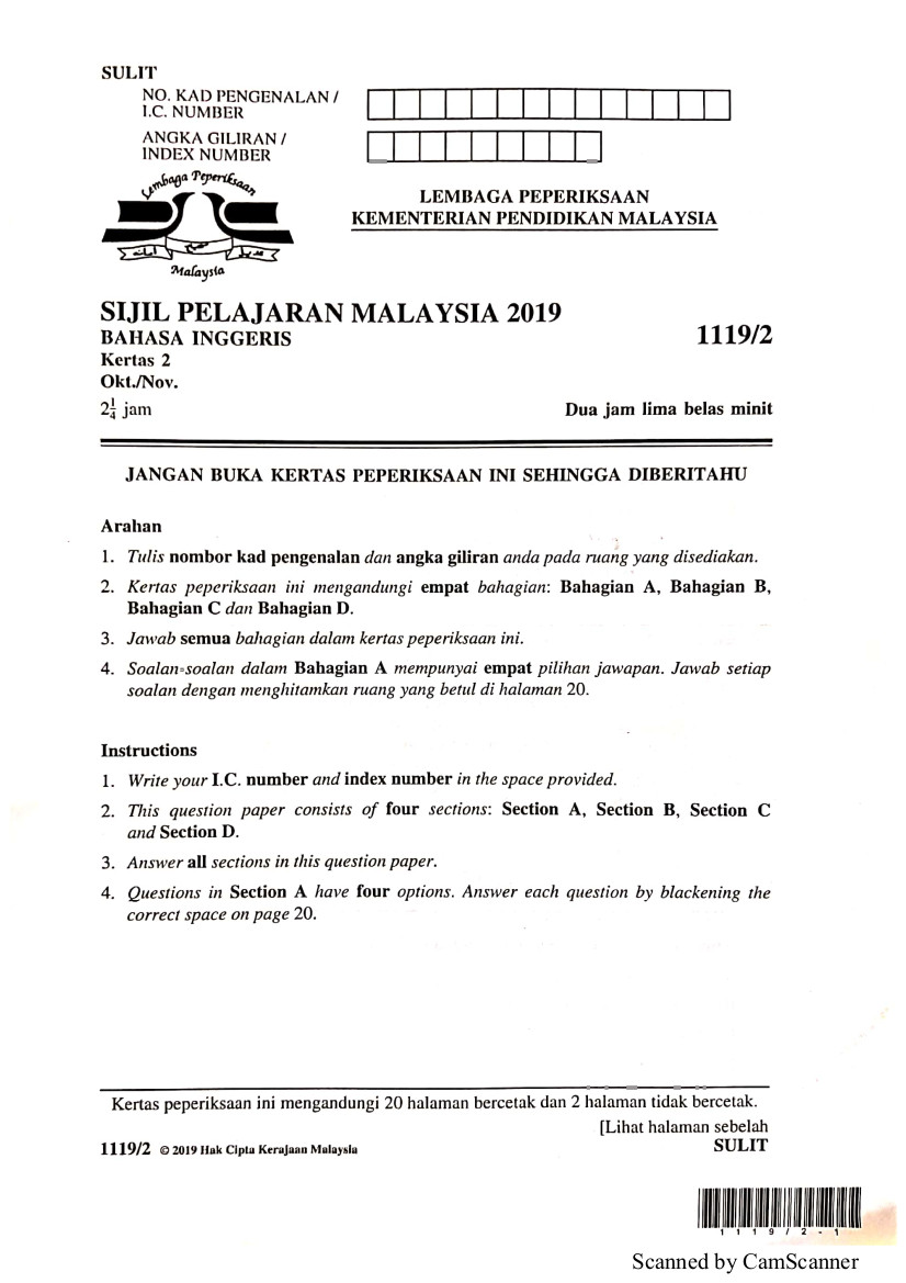 Sijil Pelajaran Malaysia 2019 Bahasa Inggeris Kertas 2
