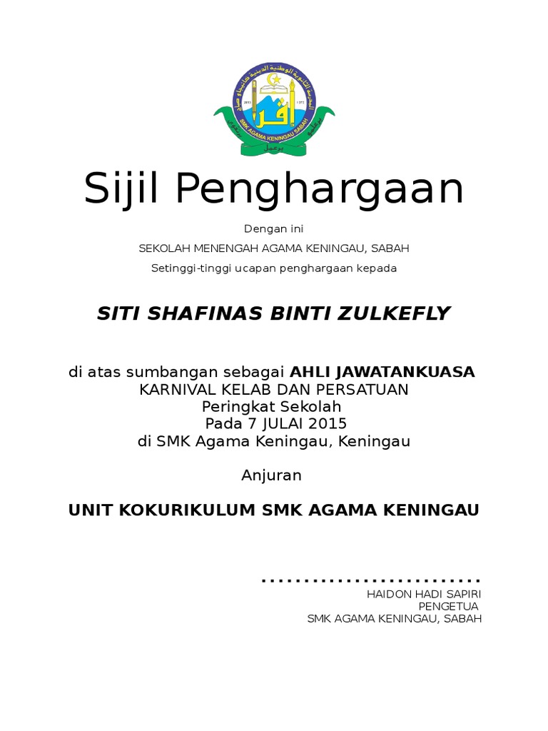 Contoh Sijil Penghargaan Dan Boleh Diedit