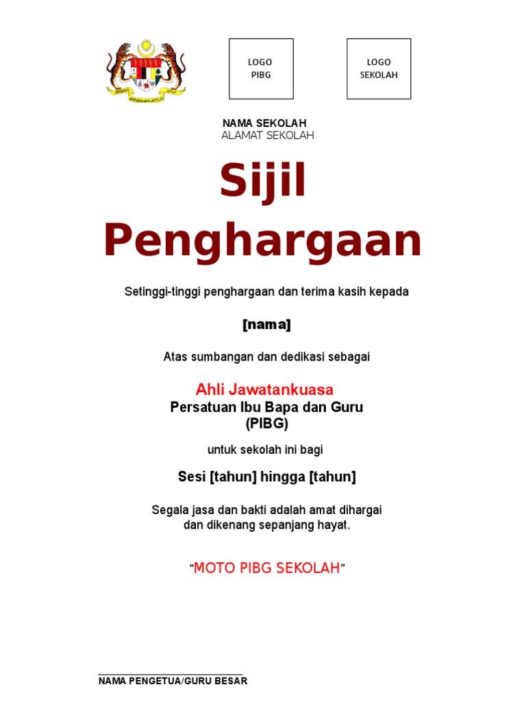 Contoh Sijil Penghargaan Pibg