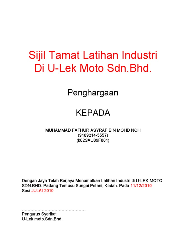 Contoh Sijil Penghargaan Tamat Latihan Industri