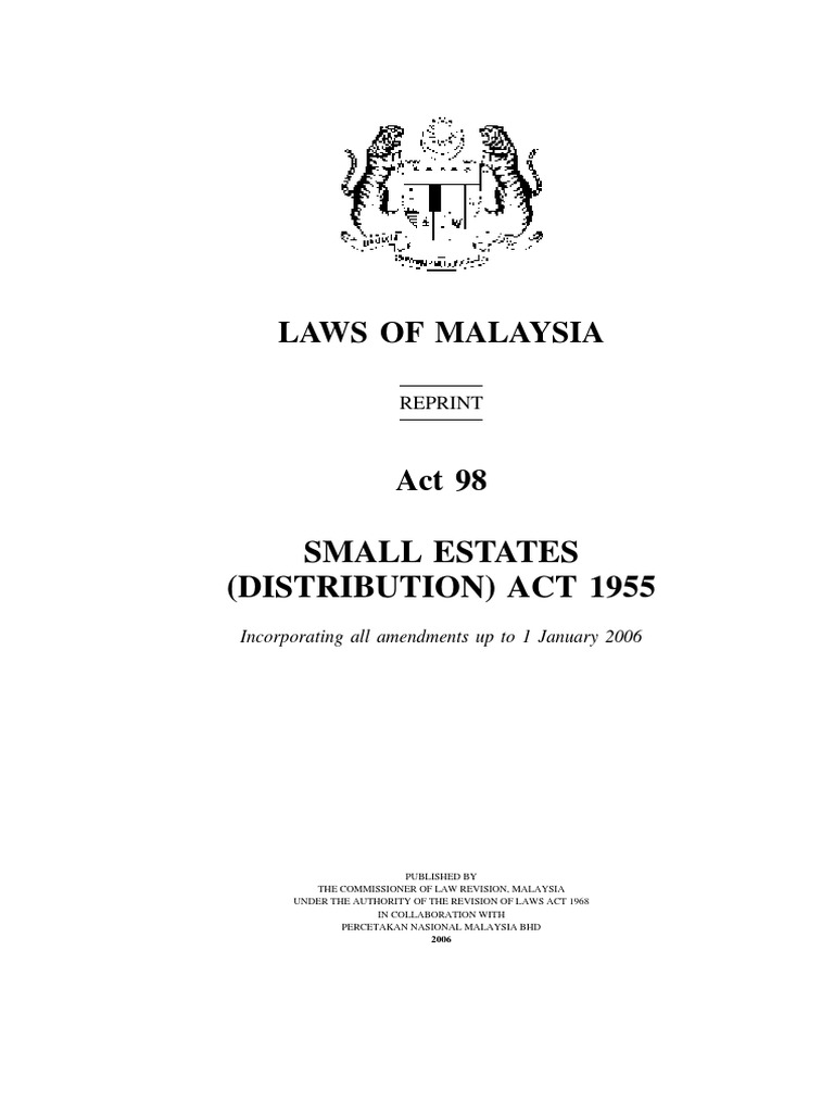 Small Estate Distribution 1955 Pdf Laws Of Malaysia Reprint Act 98 Small Estates Distribution Act 1955 Incorporating All Amendments Up To 1 January Course Hero