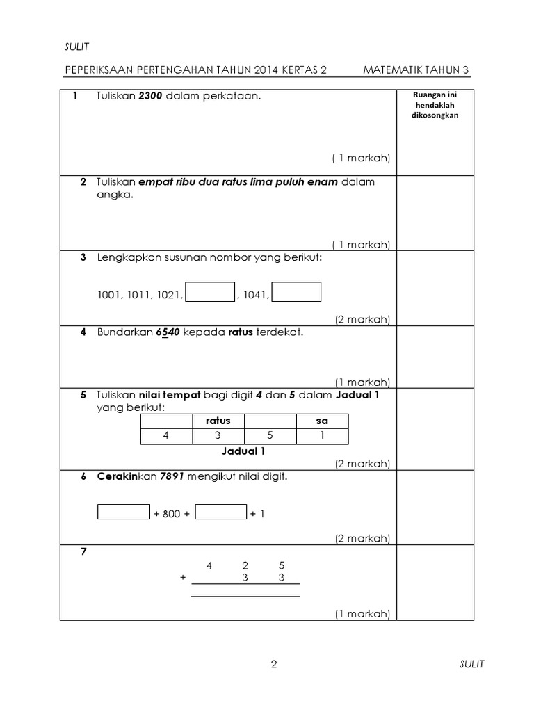Matematik Tahun 3 Kertas 2 Peperiksaan Pertengahan Tahun