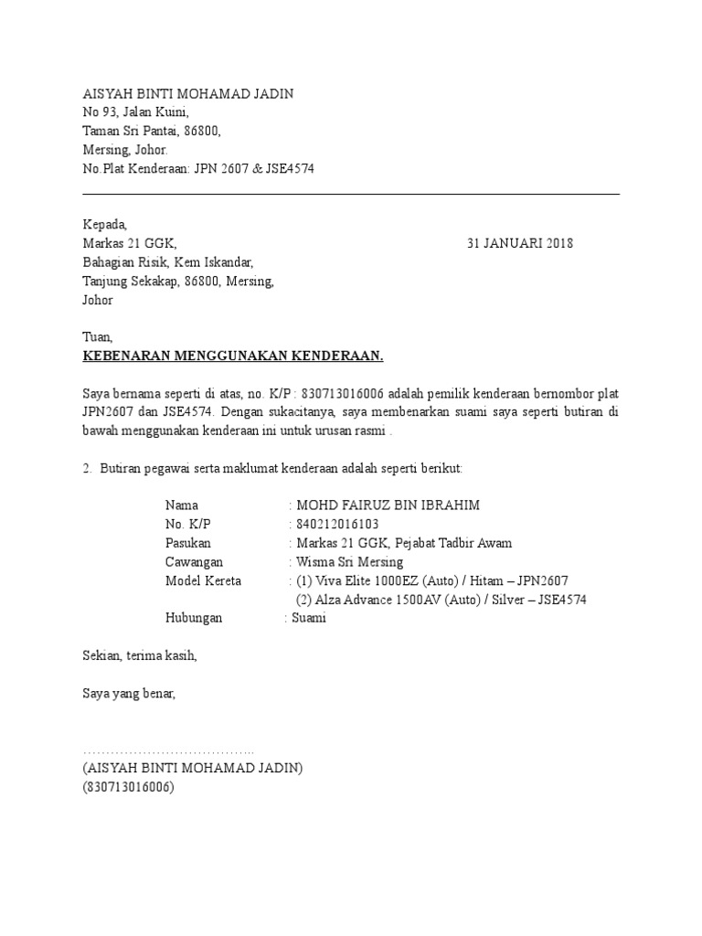 Surat Kebenaran Menggunakan Kenderaan Suami Docx