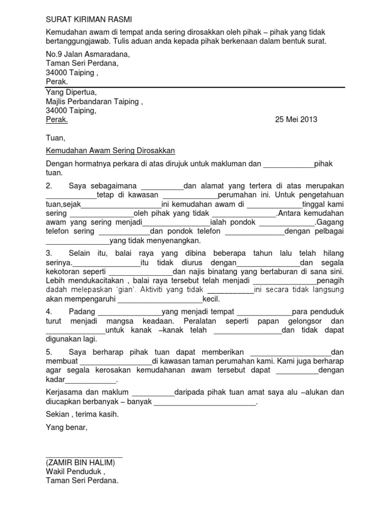 Surat Kiriman Rasmi Aduan Tentang Taman Rekreasi Surat Rasmi J