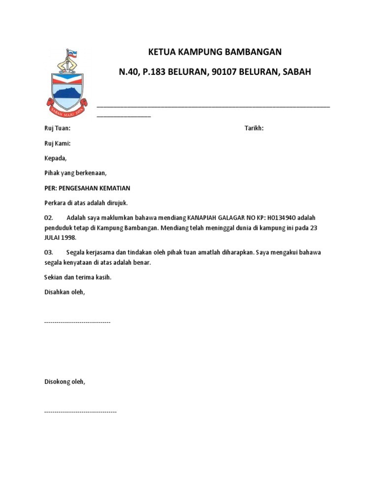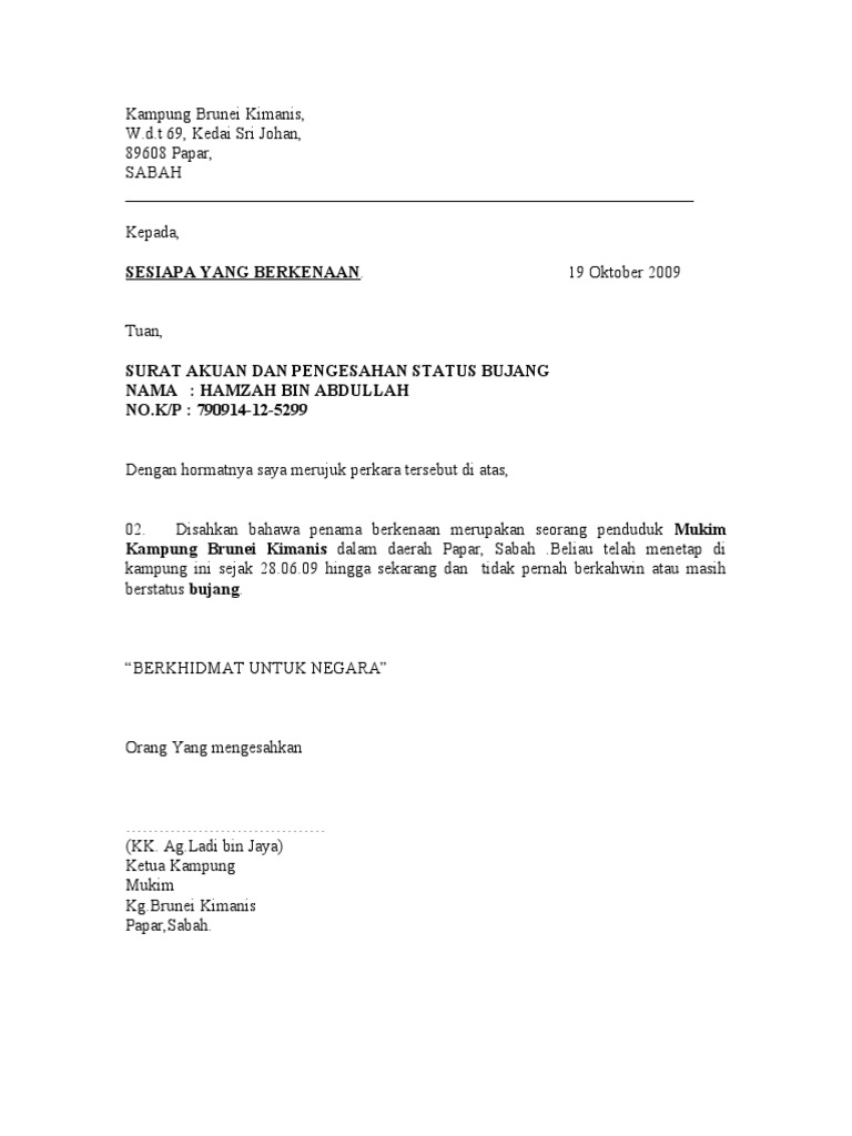 Bujang Contoh Surat Pengesahan Ketua Kampung
