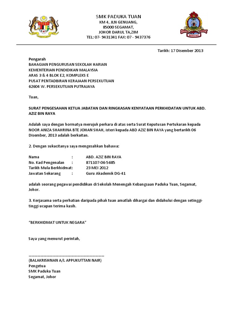 Surat Pengesahan Majikan Sekolah
