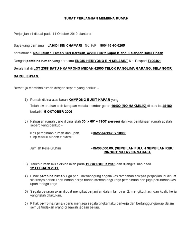 Contoh Surat Perjanjian Bina Rumah Kwsp Gawe Cv