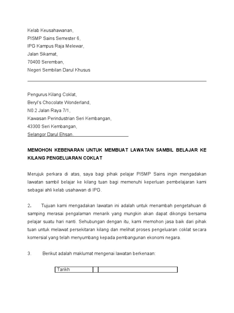 Surat Rasmi Permohonan Lawatan Sambil Belajar Ke Kilang Coklat