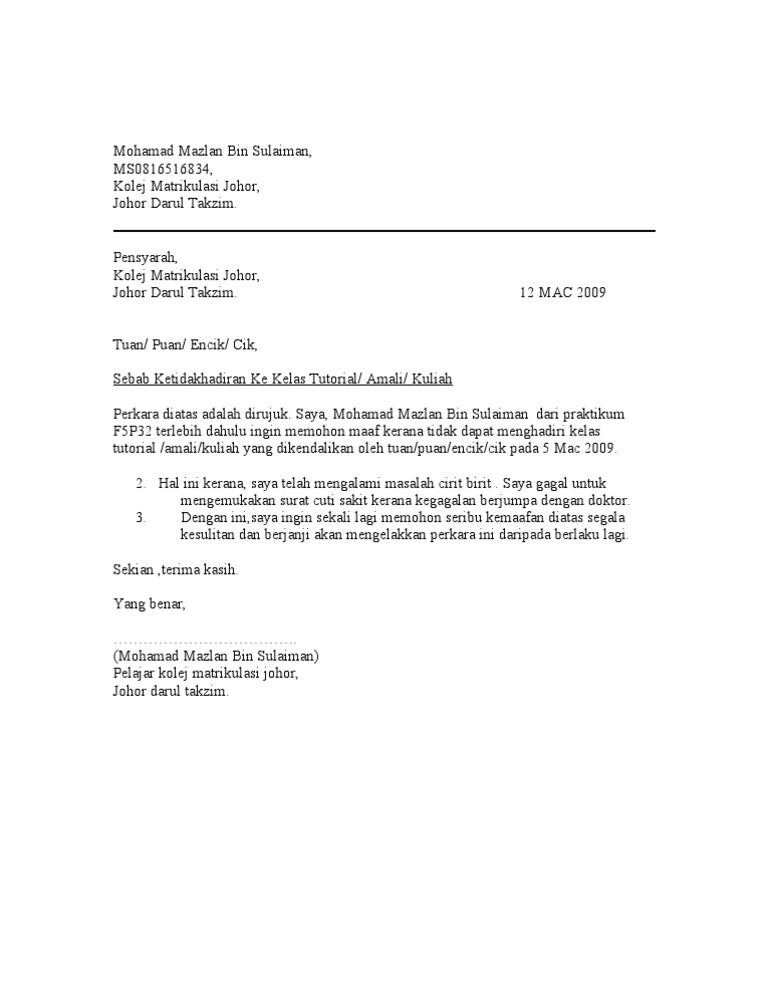Surat Rasmi Tidak Hadir Ke Kuliah Kerana Sakit Xiaominismes Cute766