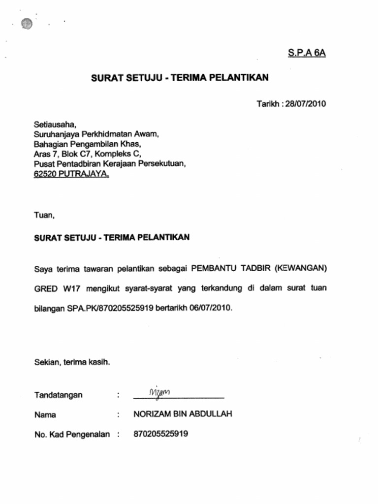 Surat Setuju Terima Tawaran Perlantikan Dg41