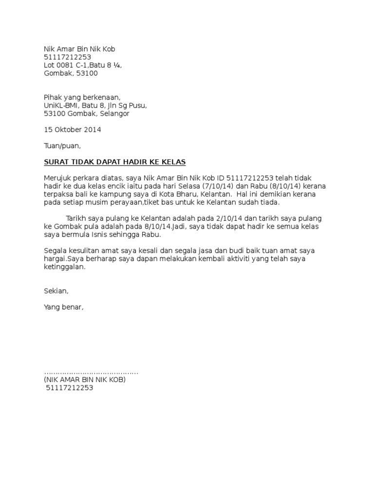 Contoh Surat Sebab Tidak Hadir Kuliah