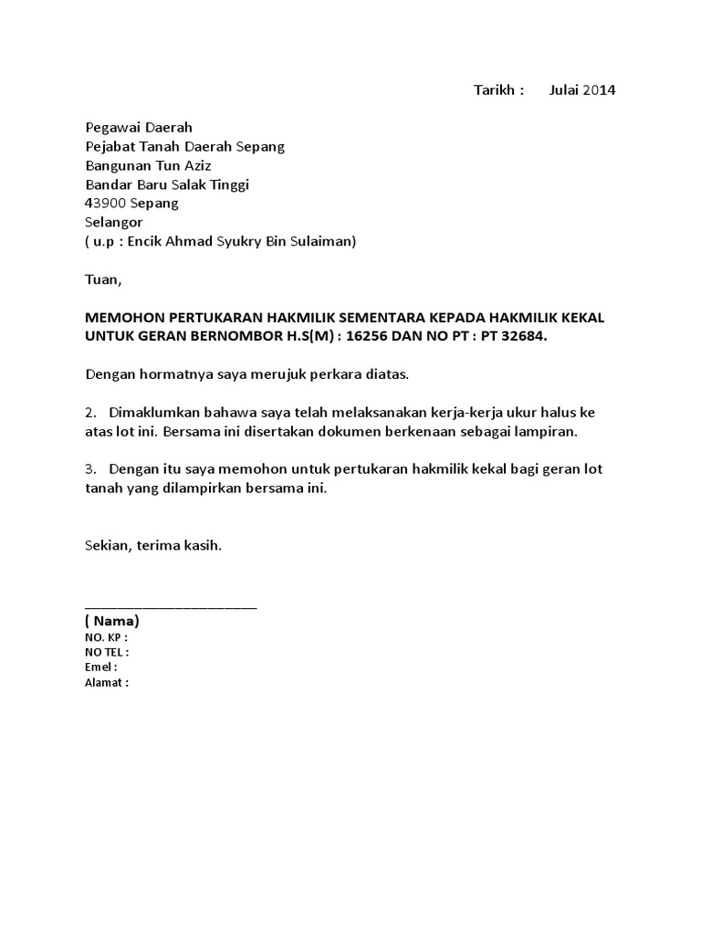 Contoh Surat Tukar Hak Milik Sementara Tanah