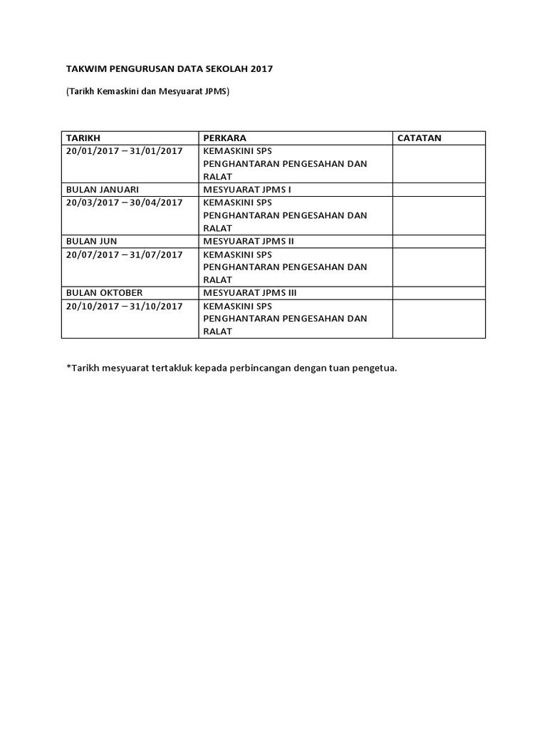 Takwim Pengurusan Data Sekolah 2017