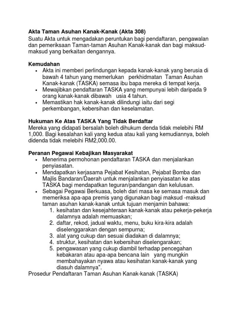 Mphonline Akta Taman Asuhan Kanak Kanak 1984 Akta 308 Child Care Centre Act 1984 Act 308 Akta Pusat Jagaan 1993 Akta 506 Dan Peraturan Peraturan Care Centres Act 1993 Akta 506 And Regulations Hingga 10hb Mac 2014