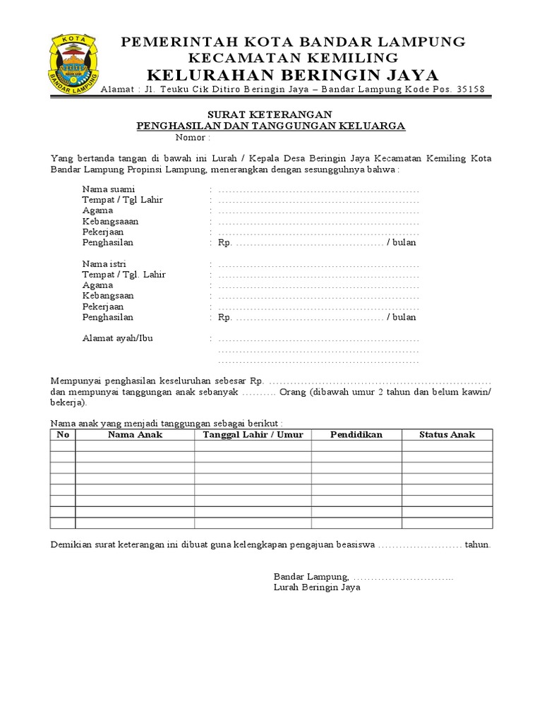 Contoh Surat Keterangan Penghasilan Dan Tanggungan Keluarga